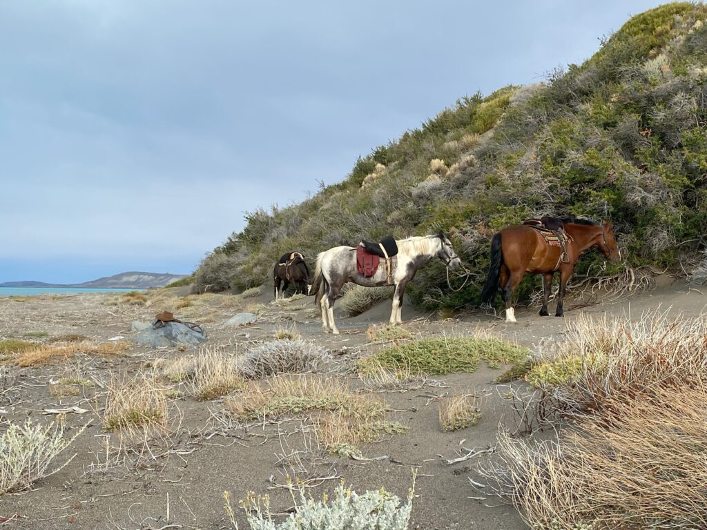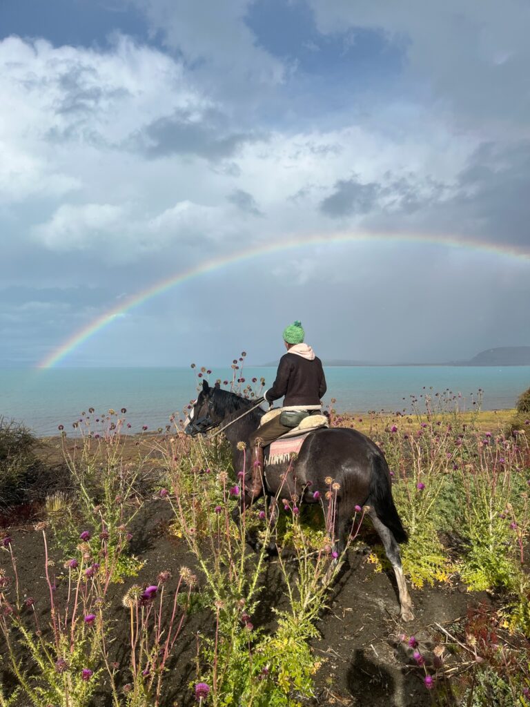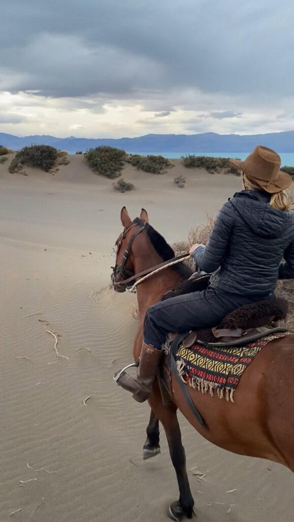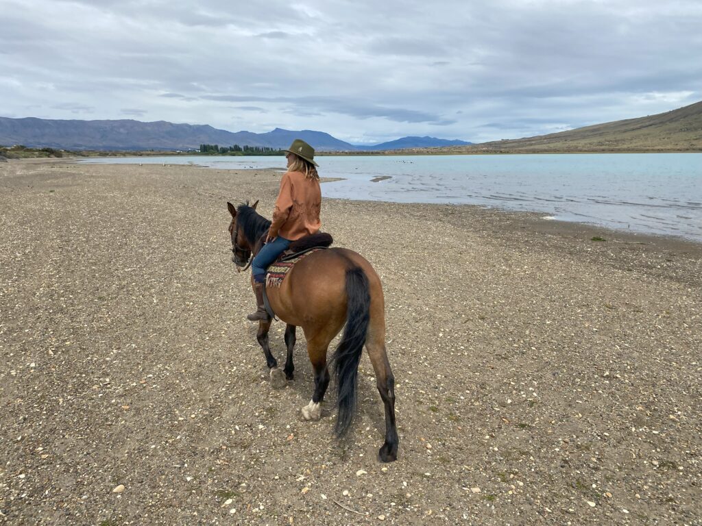 Más al final llegamos al Lago Argentino. Estaba muy lindo y tranquilo porque no había nada de viento. El día estaba bueno: no había sol, había nubes, ¡pero no hacía frío! Estaba espectacular. Caminamos un poco por el borde y después le pedí a Majo de meternos para adentro de nuevo. El lago me encantaba pero también me gustaban mucho los médanos y planos que había para galopar por dentro. ¡Qué sensación tan plena, tan linda, tan especial! Con Majo ya estábamos felices de estar dando nuestra primera vuelta y ya planeando la de la tarde. Uno se siente tan bien cuando está en un lugar tan querido. Y pareció un chiste, pero apenas nos bajamos de los caballos en el corral se puso a llover. ¡Increíble!