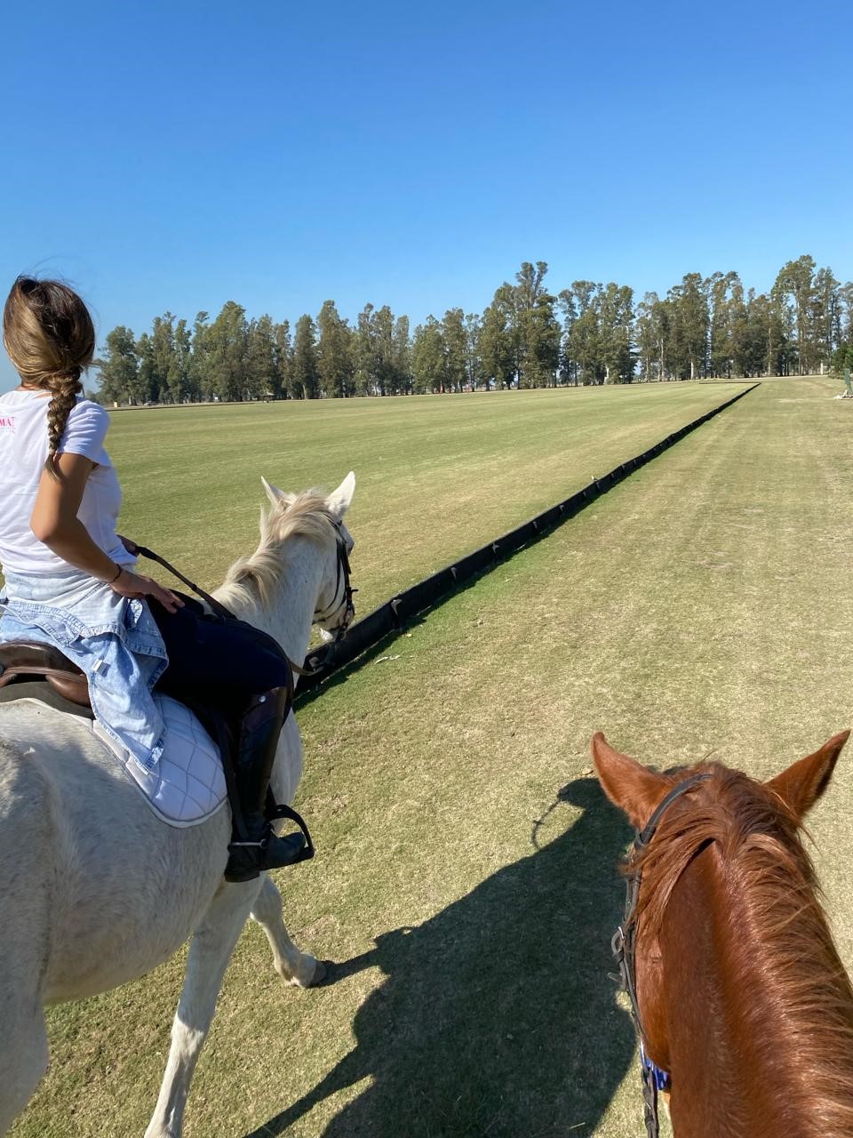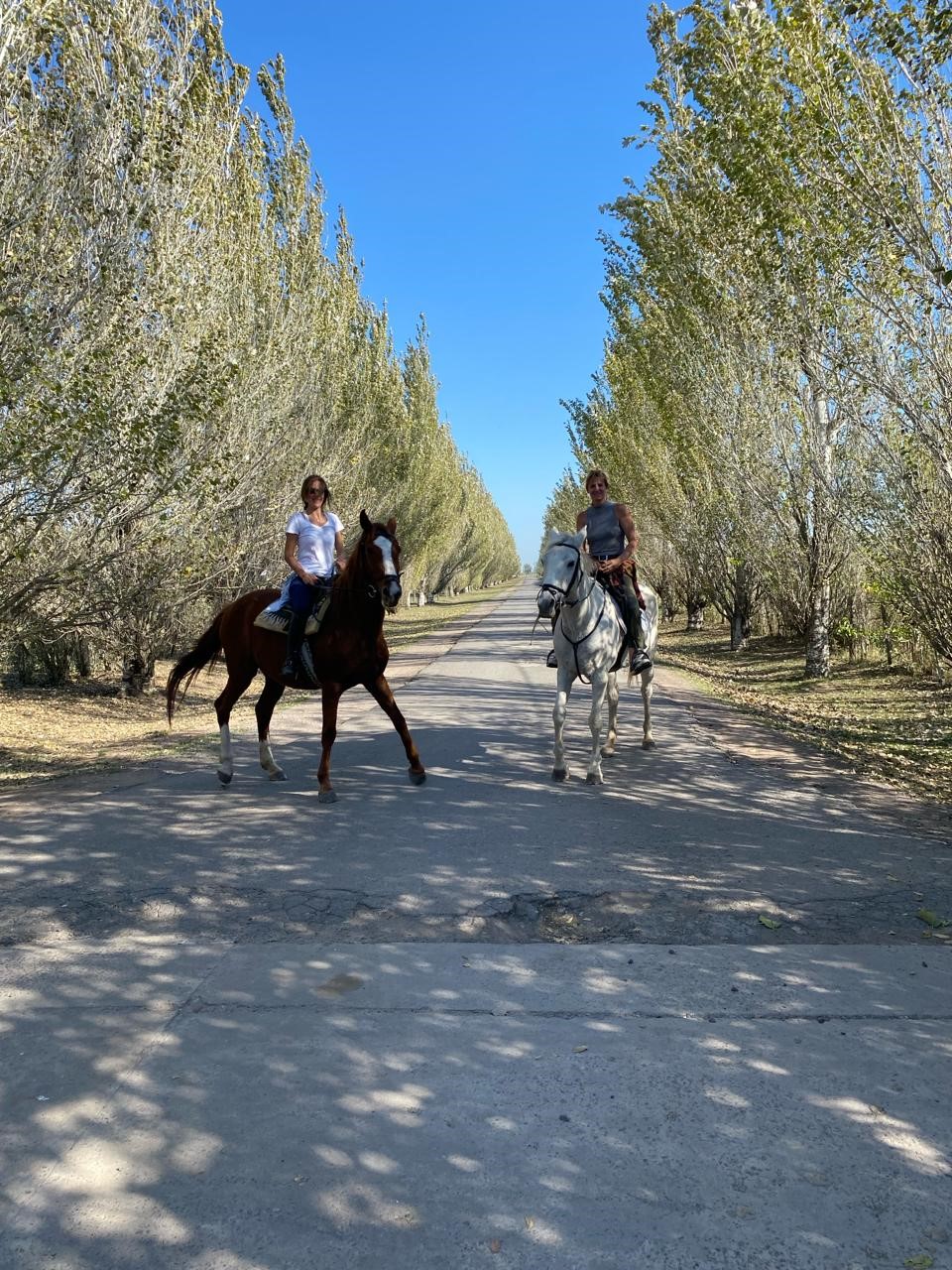 Finalmente llegamos a la entrada del club. Majo saludo a sus compañeros de la entrada y pasamos sin ningún problema. Habíamos hecho una buena vuelta, de más o menos dos horas y media, casi tres. Eran esas salidas de las que nos gustaban. Antes de seguir molestamos a los chicos para que nos saquen una foto a las dos juntas. Estábamos en el camino de entrada al club, lleno de álamos. Era muy linda para el gran final de la vuelta a caballo.