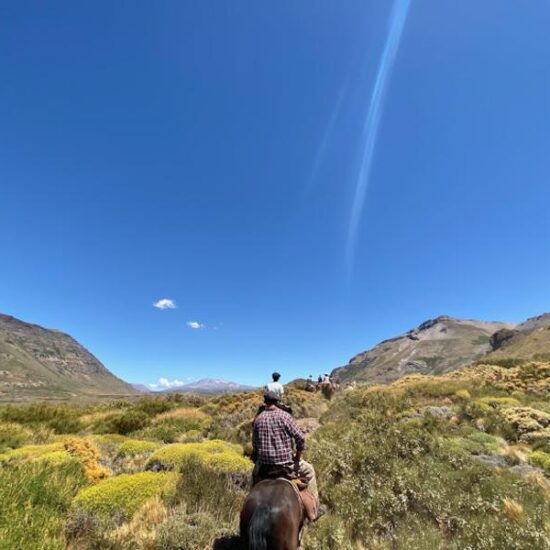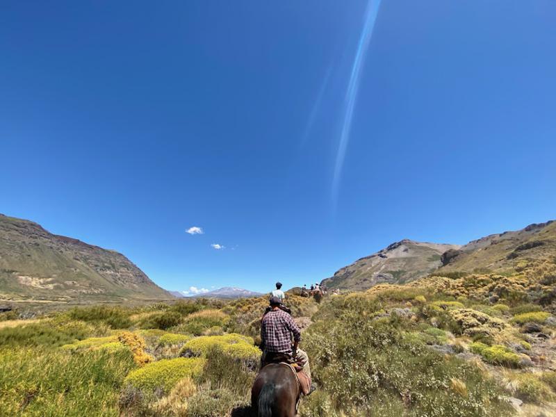 - Día 6: Luego del desayuno, con el cuerpo relajado por las curativas aguas termales, los jinetes alistaran sus caballos para seguir explorando la zona. La estancia se encuentra muy cerca del límite fronterizo con Chile. Este día la idea es ir hacia la cordillera y llegar al punto límite, hasta la “laguna del cuero”. Es una cabalgata muy linda que permite ver fauna local, como los guanacos o los cóndores andinos. Por la tarde volverán al mismo campamento para disfrutar nuevamente de los baños termales.
