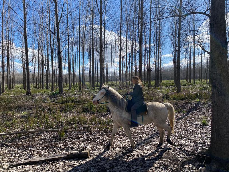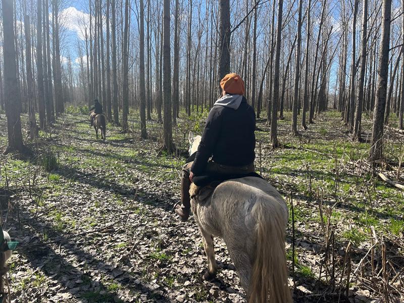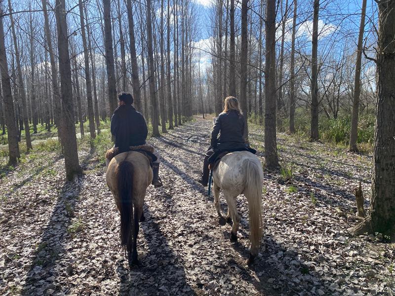 10 am: Once everyone is ready, the riders will walk with Gaby to where the horses are. It’s about a 1 km walk and absolutely worth it. The trail winds through an endless forest of poplars until it opens up to a field where the horses are usually grazing. The idea is for the horses to approach you, not the other way around. Once the connection begins, both riders and horses will walk together to the round pen.